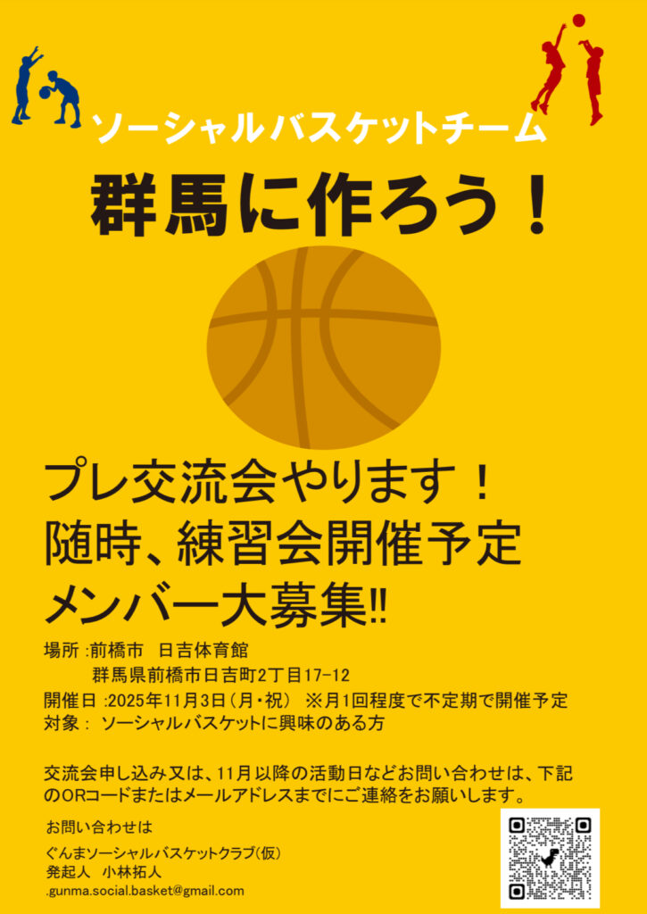 【ソーシャルバスケットボールチームを群馬に作ろう!】プレ交流会開催決定! 2025 10/14 地域イベント 2025年10月13日 地域イベント よかったらシェアしてね! URLをコピーしました! 【申込受付中】エンジョイカップ2025九州プレ大会』 関連記事 【レポート】九州地区ソーシャルバスケットボール合同練習会 2025年7月11日 大阪でバスケットボールフェス『UNITE』開催! 2023年4月12日 元日本代表選手の渡邉拓馬氏を招いたクリニックのレポート 2020年1月14日 京都で開催される元日本代表渡邉拓馬氏を招いたクリニックのご紹介 2019年12月26日 大阪でフットサルとのコラボイベント開催 2019年2月6日 『精神障害者スポーツフェスタin藤沢』が行われました。 2019年2月5日 精神障がい者バスケットボール交流会 in TOKYO 2016年6月14日